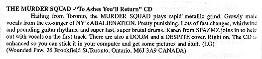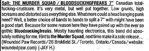 I love the CD title... cute. Ah good ol' "Crust", the ever cantankerous Punk cousin of Metal's Grindcore movement. Truth be told, it's often very hard to find where the line is drawn between the two near-identical genres. More often then not, the line doesn't even really exist, and the only thing that makes one band Punk, and another Metal is their haircuts, and choice of t-shirt. Case in point, this new split CD from cross boarder label-mates The Murdersquad t.o. (from Toronto) and Hulluus (outta Wisconsin). First up is The Murdersquad t.o. with their contribution of five tracks of ear-splitting, Punked-out, grinding Crust. The band was formally known as just Murder Squad, but changed the name when the Death-Metal super-group of the same name (formed by members Entombed and Dismember) hit the scene (and have since released two excellent full-lengths BTW). Now, granted, this Toronto band is a lot more Punk than they are Metal, but the music is still a swirling combo of ideas pulled from both camps. Just take a song like "Relationship Of Bacteria", the vocal delivery (although identical in nature to many Death-Metal acts) is spat out in a very Punk, almost Hardcore style, and most of the song has a typical Punk feel. But then there is a mid-paced breakdown halfway into the song that's just so fuckin' Metal it had me head-bangin' and giving the full devil-horned salute while driving down the highway! Anyway, as far as this disc goes, The Murdersquad t.o. comes off as the faster, and I guess more Punk of the two bands. The next four tracks, courtesy of Hulluus, are still heavy as all hell, but have a slightly (just slightly mind you) slower tempo, and a delivery style that puts them in line with almost every Death-Metal and Grindcore demo I acquired in the late 80s. For that reason, I personally gravitate a bit more to their sound, but the two bands manage to compliment each other nicely. They're different enough to offer up a small variety of flavour, but similar enough that they seem right at home nestled together on the same disc. I can't imagine someone liking one band, and not the other. So if you dig one of these acts, and don't know the other, rest assured that the other half of this split should be right up your alley as well. For more info, check out Wounded Paw Records.